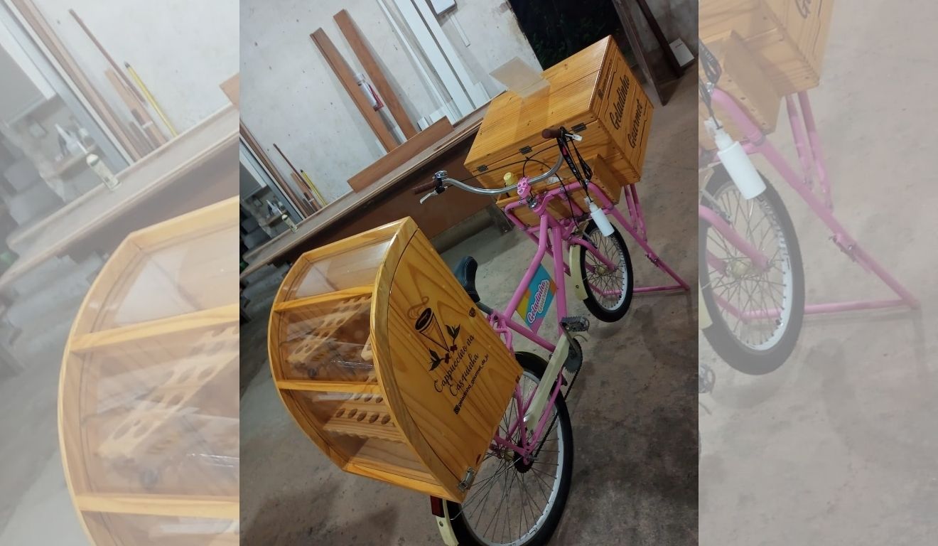 Eu não queria uma bicicleta vermelha, azul, preta, porque iria parecer uma bicicleta que carregava gás, ou uma de supermercado. Eu falei com a minha esposa: ‘eu quero uma bicicleta rosa’, e ela me perguntou o porquê. E eu falei que o rosa traz um frescor. Eu lembrei das sorveterias europeias, elas trabalham muito com o rosa, principalmente o rosa bebê ou o azul bebê. São cores leves e alegres. Eu sabia, antes mesmo de ter a bicicleta, que a cor rosa e as madeiras envernizadas seriam atrativas e convidativas.