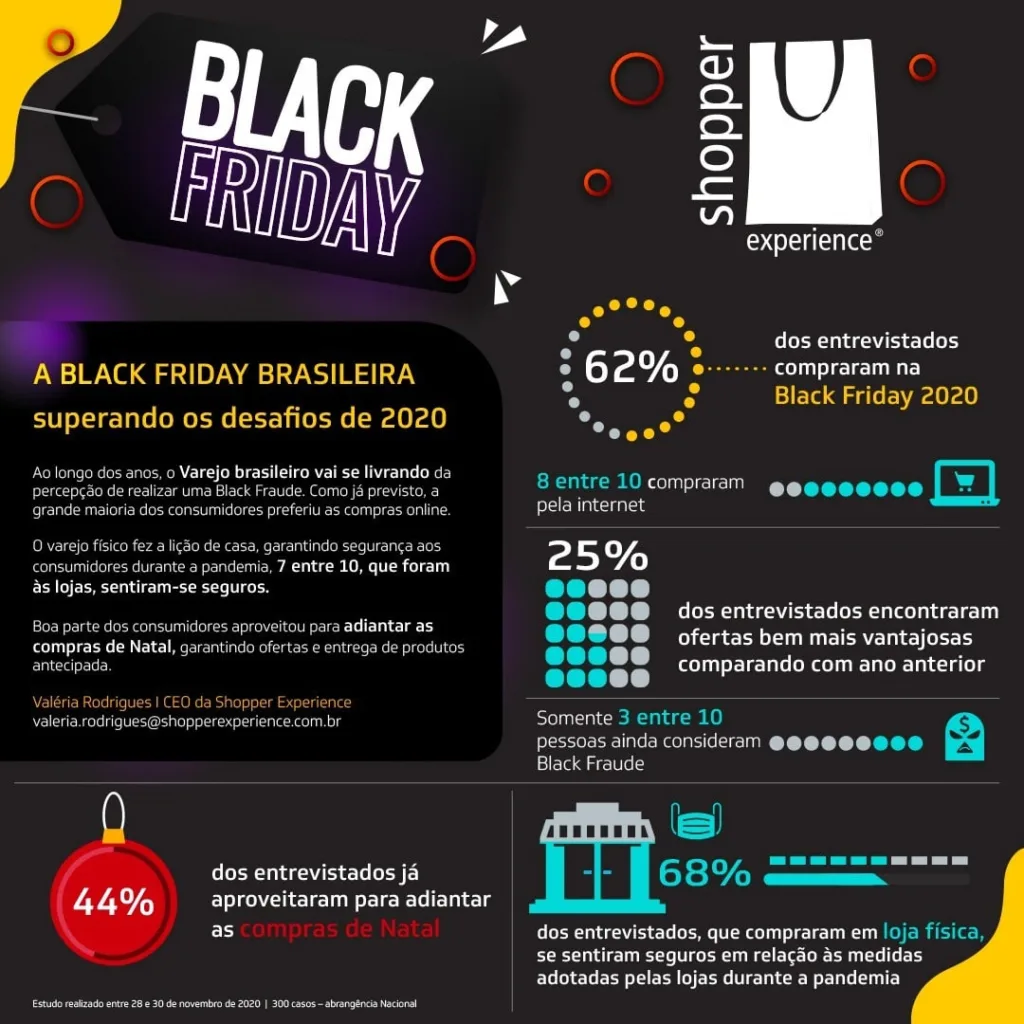 Segundo dados apurados na pesquisa temos – 62% dos entrevistados compraram este ano; Oito em cada dez compraram pela internet; 25% dos entrevistados encontraram ofertas bem mais vantajosas que a edição passada; Três em cada dez pessoas ainda acreditam que é uma “Black Fraude”; 44% já aproveitaram para adiantar as compras de Natal; 68% que compraram em loja física se sentiram seguros com relação às medidas de segurança adotadas pelas lojas durante a pandemia. Os gráficos abaixo mostram todos os resultados. Quem responde pela pesquisa é Valéria Rodrigues, sócia-diretora da Shopper Experience e responsável pelo estudo.