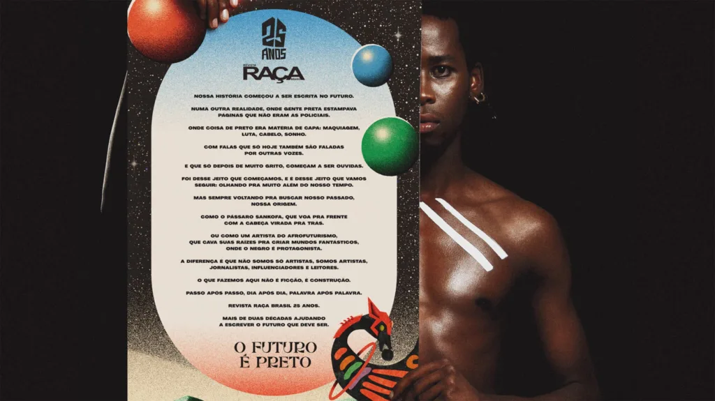 Revista Raça comemora 25 anos de existência com campanha Afrofuturista – Cunhado em 1994 e difundido no final da década de 1990 pela socióloga americana Alondra Nelson, o Afrofuturismo é o movimento cultural, estético e político que se manifesta na literatura, cinema, fotografia, moda, arte e música, a partir da perspectiva negra. O conceito traz protagonismo aos povos pretos por meio de celebração de sua identidade, ancestralidade e história, retratando um futuro grandioso e que se caracteriza tanto pelas tecnologias avançadas quanto pela superação e ressignificação das condições determinadas pela opressão racial, dentro do contexto da vivência africana e diaspórica. A Revista Raça, primeira e mais conceituada publicação do Brasil com conteúdo relacionado à cultura afro, comemora seus 25 anos de existência com “O futuro é Preto”.