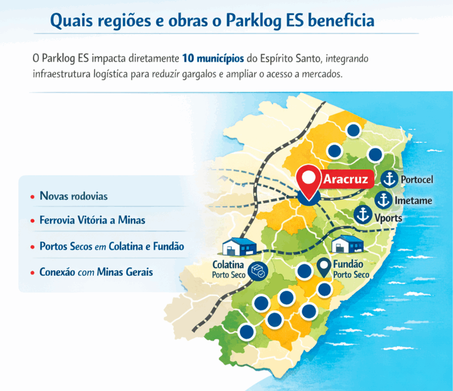 Com epicentro no município de Aracruz, Norte capixaba, o Parklog ES tem uma abrangência territorial mais ampla e atua como um vetor de organização logística e econômica regional.