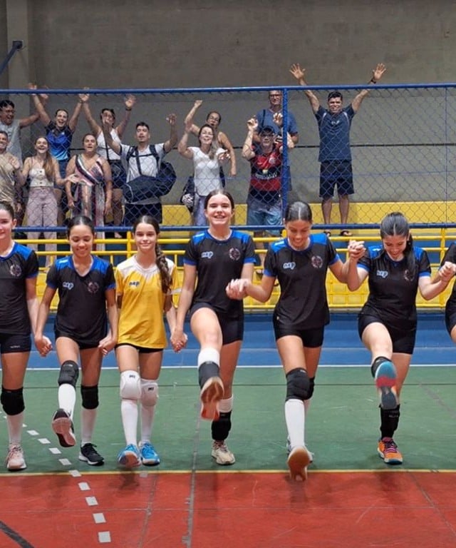 Valentina, de 13 anos, é acostumada a jogar vôlei pelo seu clube, o Vôlei Vida. Nesses Jogos Estudantis, é a primeira vez que ela atua pela escola e avalia que a experiência tem sido muito positiva.