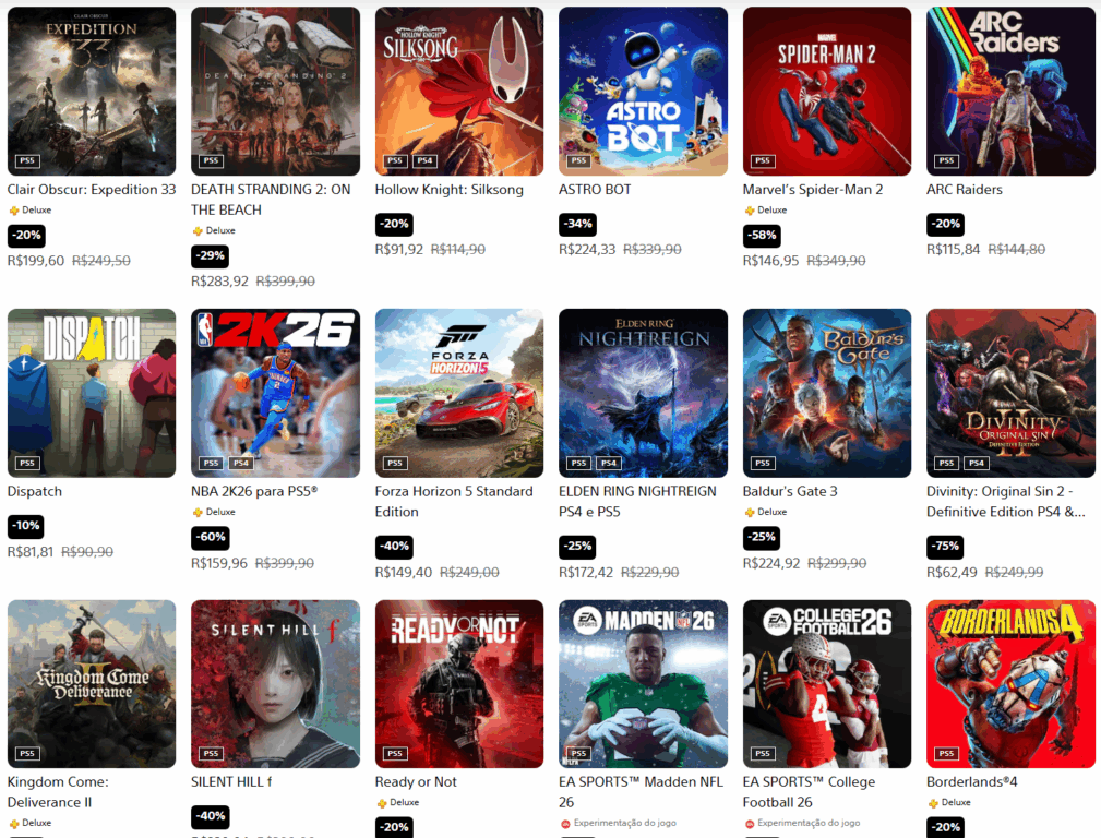 Entre os destaques estão Holow Knight: Silksong com 20% de desconto, Minecraft com 25%, GTA V e Red Dead Redemption com 50%, EAFC26 com 60% de desconto; e The Elder Scrolls Onloine 75% mais barato, além de jogos como Hogwarts Legacy, Star Wars Jedi: Survivor e Assassins Creed: Valhalla com 85%.