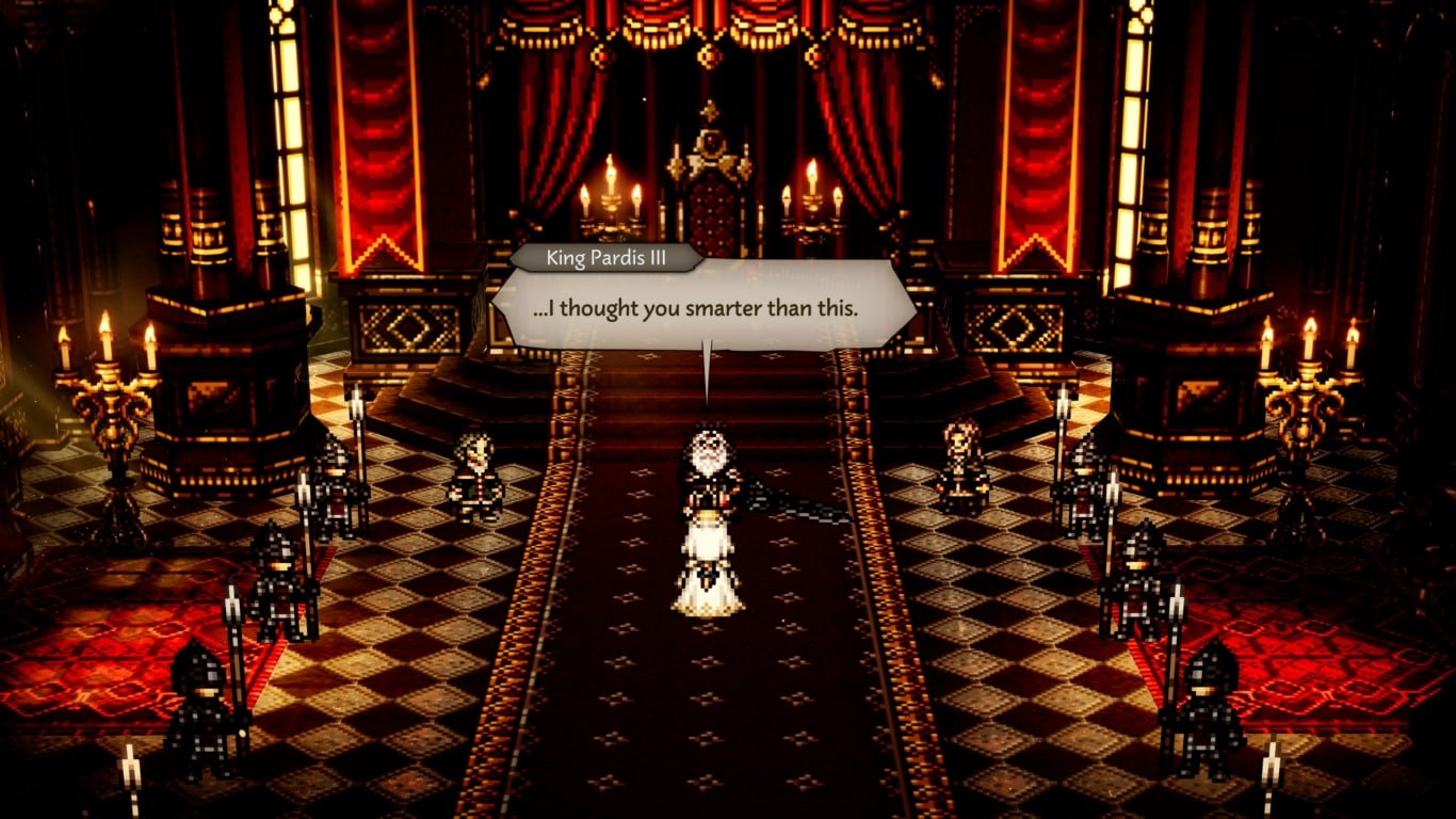 Alguns ajustes de design dificultam a vida no início. A obrigatoriedade de montar times completos desde o começo engessa a progressão. A construção de mundo sofre com mapas simplificados e textura lavada — especialmente perceptível em telas grandes. Mas não tem desculpa pro downgrade perceptível nas falas em inglês comparado ao Octopath II. Acabei voltando pro áudio japonês.