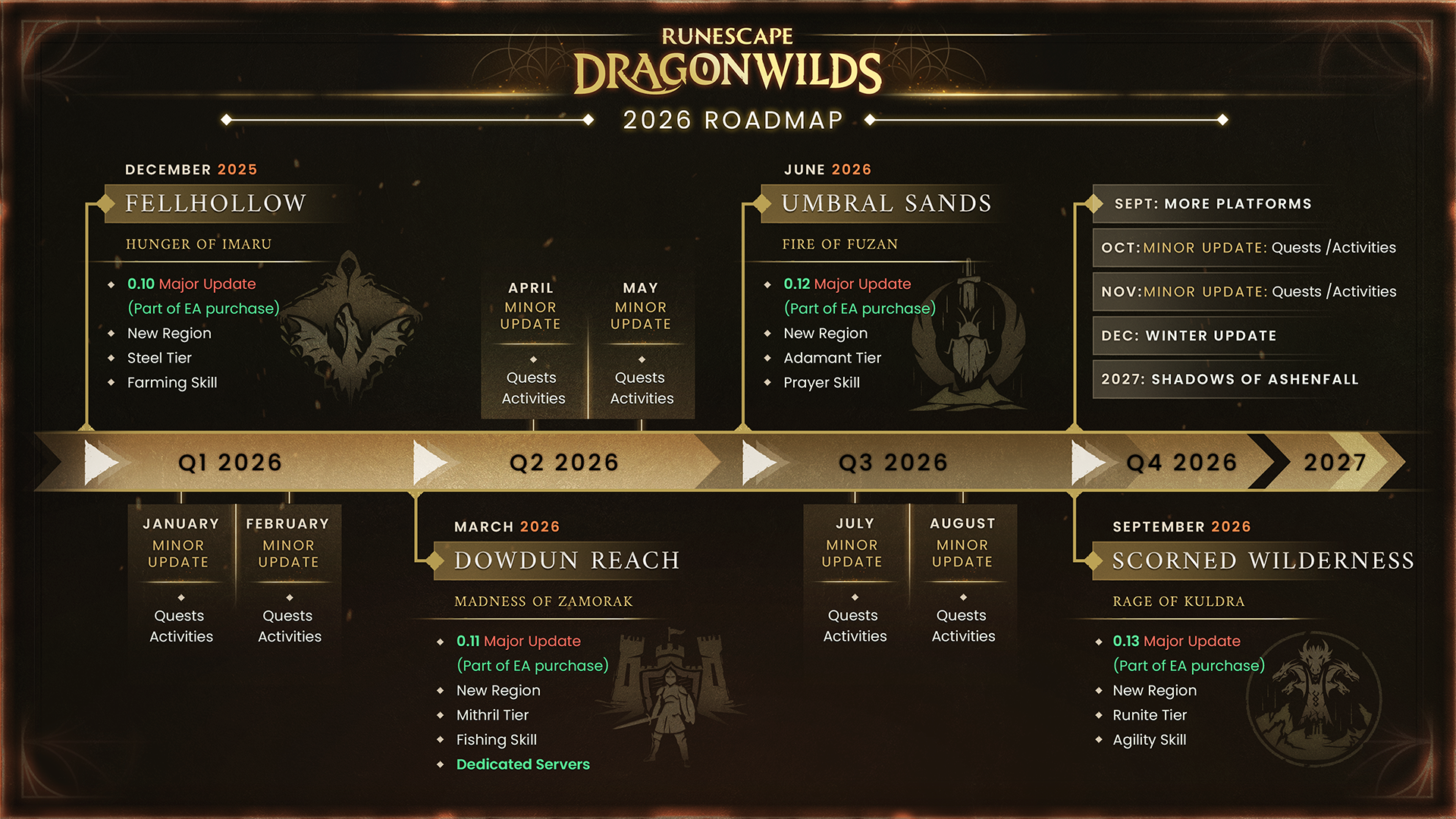 Além dessas grandes atualizações, RuneScape: Dragonwilds também receberá atualizações menores mensais, adicionando novas missões e atividades ao jogo, além de melhorias de qualidade de vida.