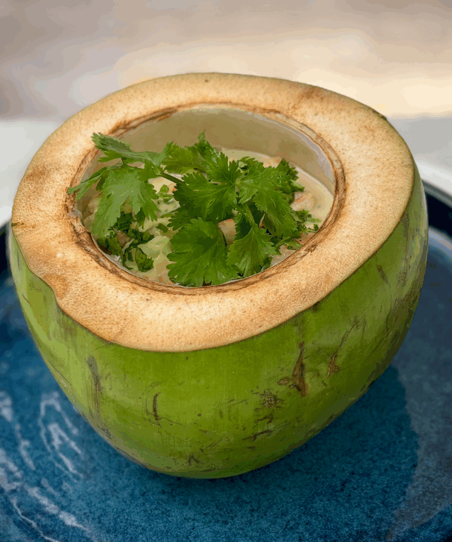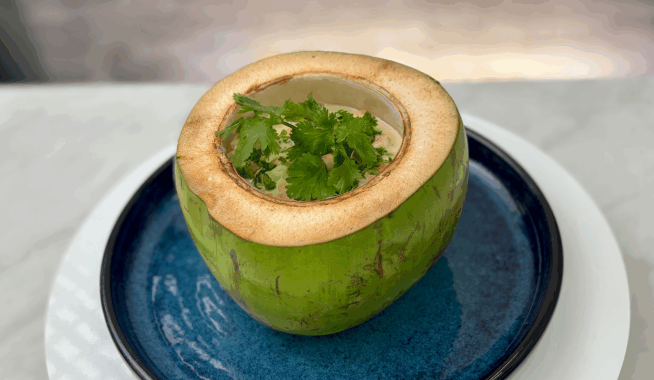 - Sirva nos cocos, decorado com coentro e cubinhos de tomate.