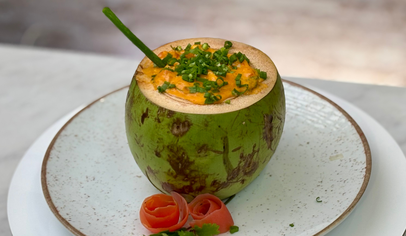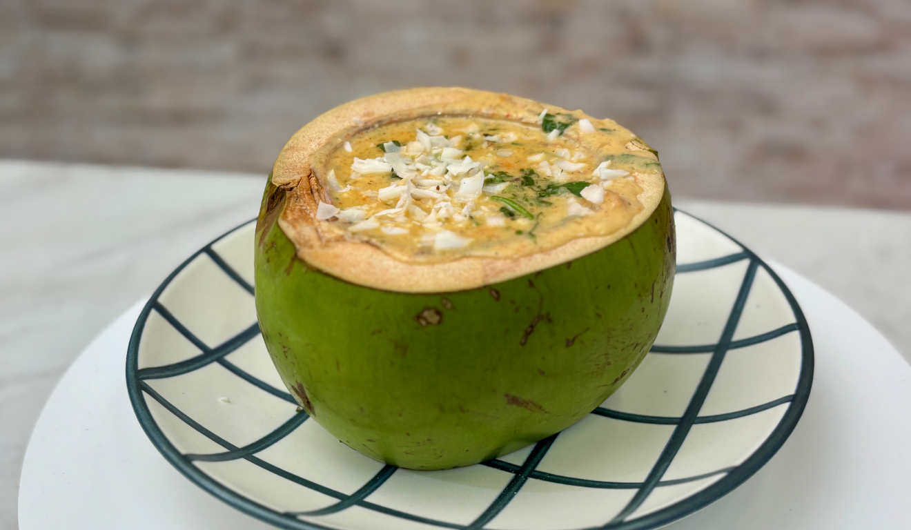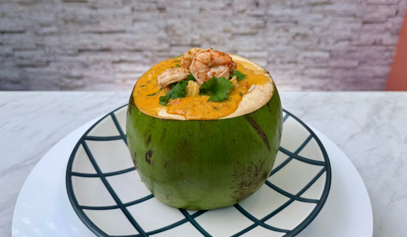 - Voltar os camarões, cozinhar 1 minuto, acrescentar coentro e servir no coco verde.