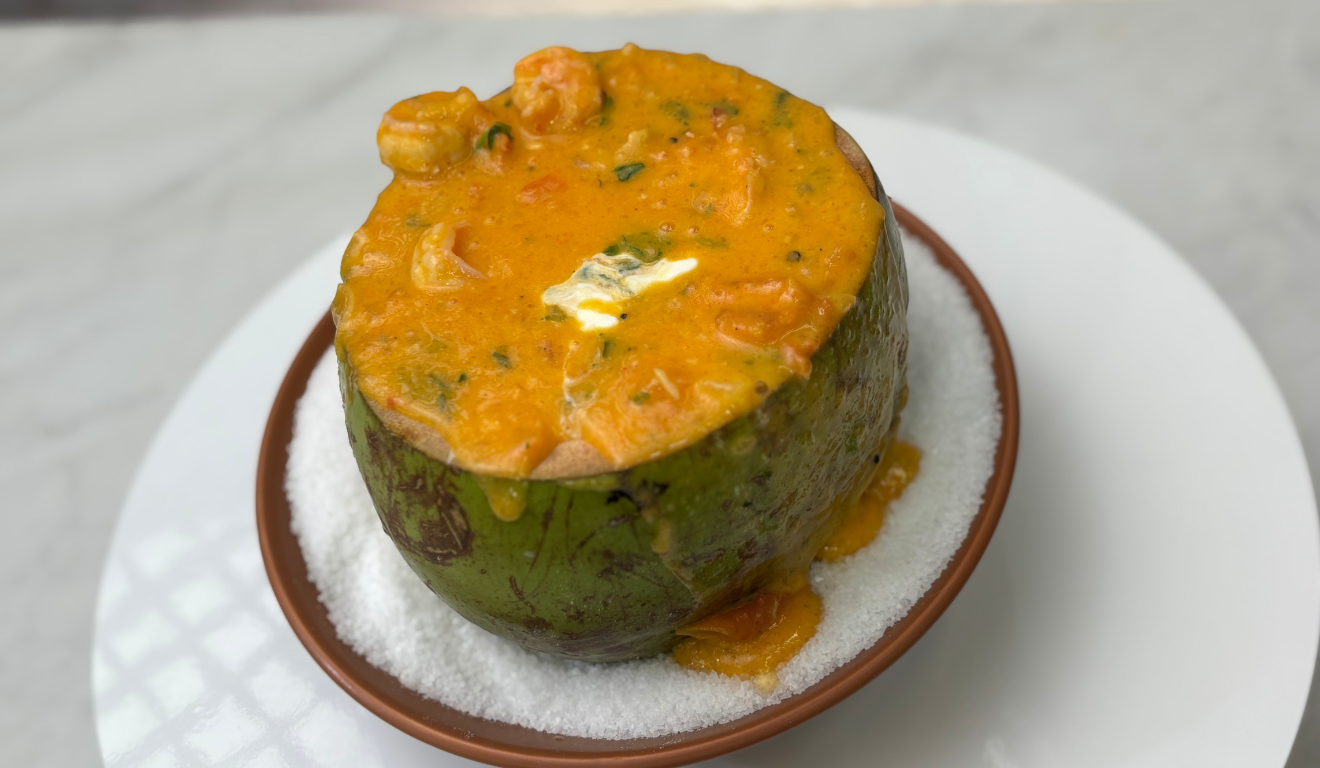 - Acrescentar creme de aipim, ajustar tempero e finalizar com coentro.