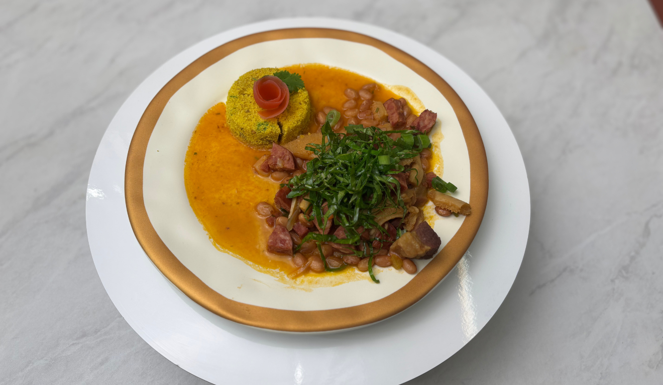 A dupla apostou na dobradinha com feijão branco e carne seca, valorizando o sabor tradicional, mas completou o prato com couve refogada e farofa de alho para dar frescor e crocância. Apesar da combinação saborosa, o tempo de cozimento longo exigiu atenção, e pequenos detalhes na textura poderiam ter rendido pontos extras.