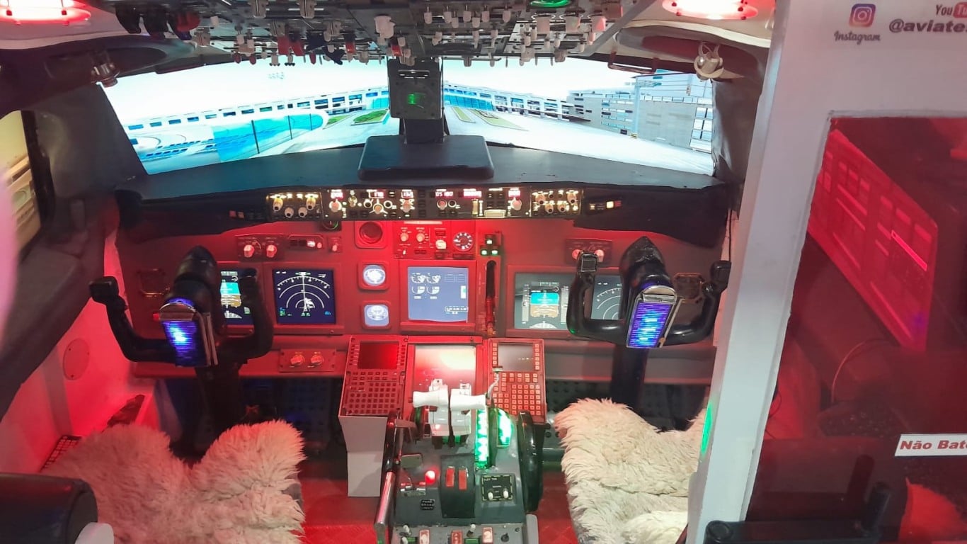 “O simulador é privado, construído por mim e pela minha esposa, Jocemara Freitas. Levamos cerca de oito meses para desenvolver todo o equipamento”, explica o comandante Valmir Freitas, responsável pela atração. Segundo ele, a ideia nasceu justamente da rotina de quem enfrenta longas distâncias na estrada. “A pessoa está viajando, precisa parar para descansar, fazer um lanche. Aqui, além disso, ela tem um momento de descontração, sentando dentro de um cockpit, como se estivesse pilotando um avião.”