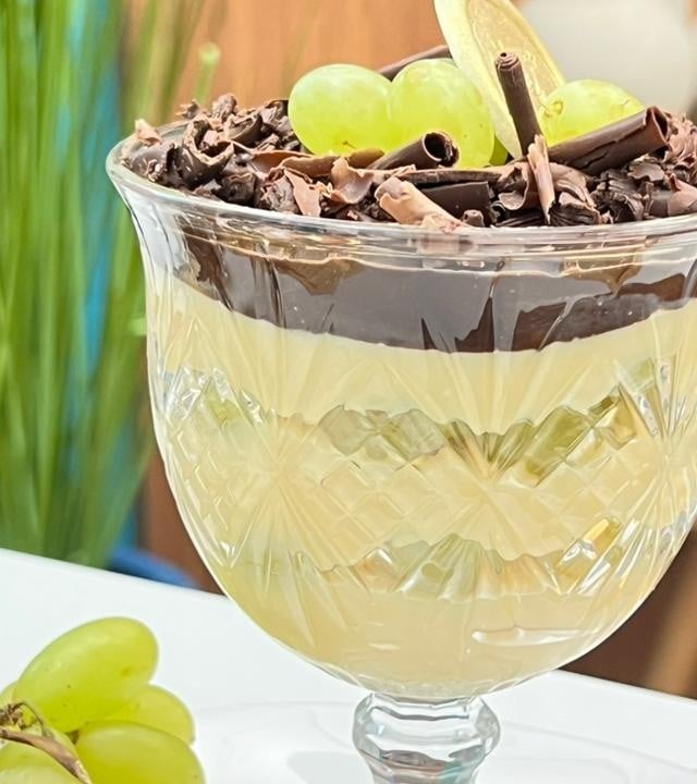 Em taças individuais ou em um refratário, coloque uma camada de brigadeiro branco, distribua as uvas sobre o creme e finalize com a ganache de chocolate. Decore com mais uvas por cima ou, se preferir, substitua por morangos ou outra fruta de sua preferência.