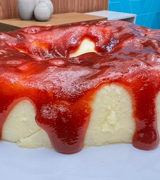Além de delicioso, o preparo é simples e prático: a base leva apenas cinco ingredientes, como leite condensado, requeijão e queijo parmesão, que garantem a textura firme e cremosa do pudim. A calda de goiabada derretida por cima traz o contraste perfeito, deixando o doce ainda mais irresistível.