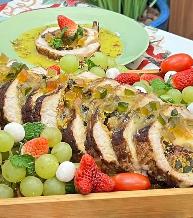 A proposta é simples, mas cheia de técnica: o lombo é aberto em manta, marinado por algumas horas e recheado com uma farofa úmida e aromática, preparada com cenoura, alho-poró, uvas-passas e frutas cristalizadas. Depois de selado na frigideira, ele vai ao forno em baixa temperatura, garantindo uma carne extremamente suculenta e um molho encorpado feito com a própria marinada. Para quem busca praticidade sem abrir mão do sabor, é uma receita que vale cada minuto de preparo.