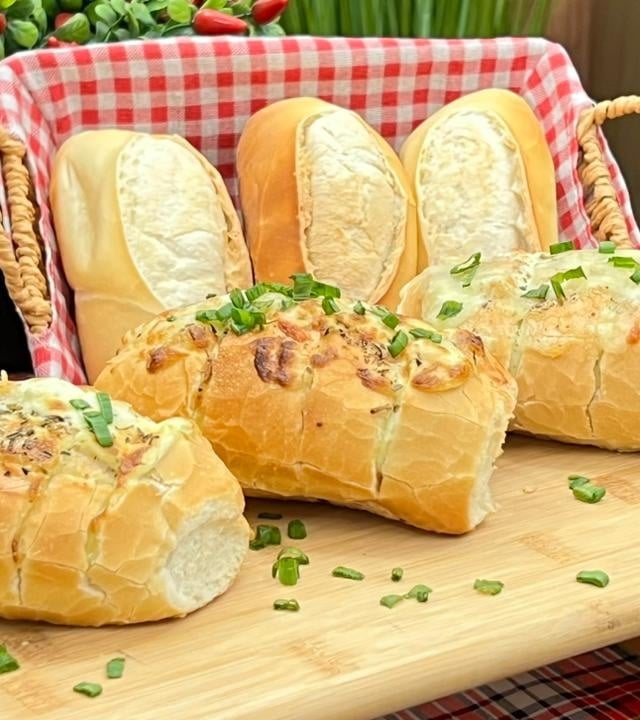 Utilize o creme para rechear os pães, espalhando bem entre os cortes e sobre a superfície. Leve à grelha, forno ou air fryer até dourar e ficar levemente crocante. Sirva quente.