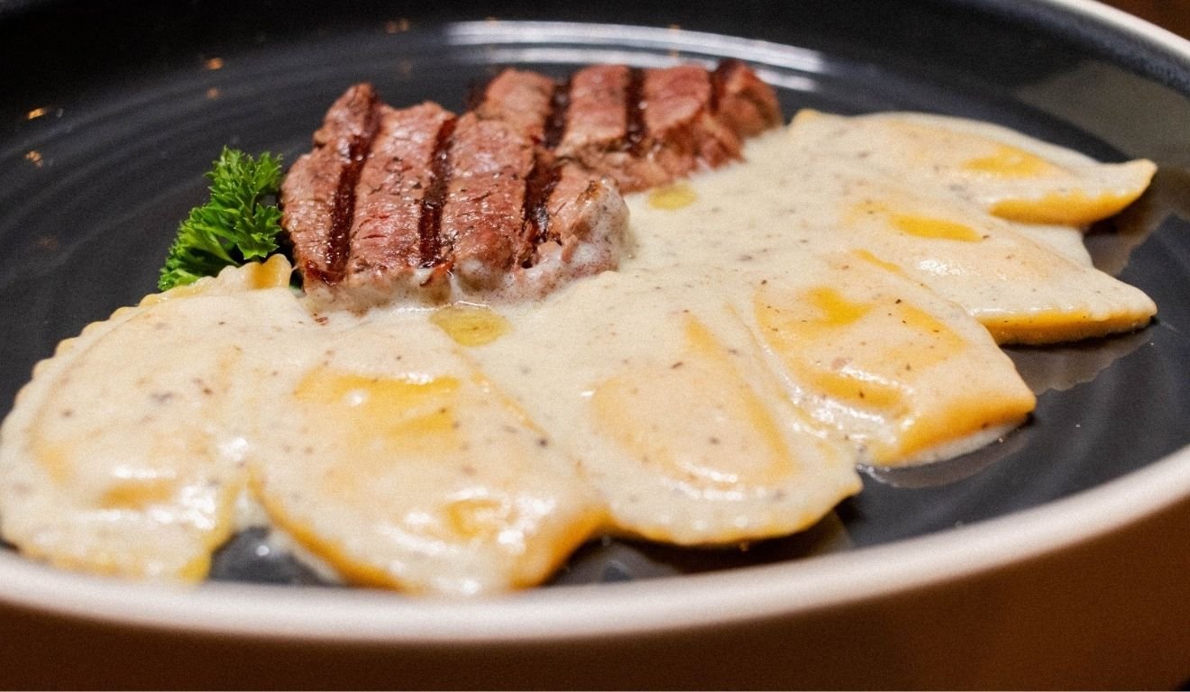 - Principal: Raviole de camarão na massa de tinta de lula, manteiga de tomilho cítrica ou polpetone recheado com búfala, gratinado no forno a lenha, com gnocchi na fonduta de parmesão