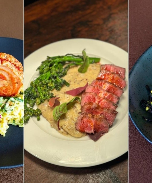 - Entrada: Crudo de Sol no Brioche Tostado na Manteiga e Aioli de Alho Assado ou Salada Cítrica de Grãos e Baby Sprouts.
