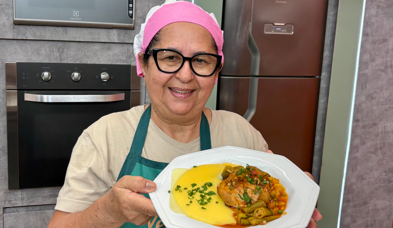 Vera trouxe um frango com quiabo bem temperado e textura macia, com pouca baba no preparo, mas a adição de queijo não foi justificada. Ainda assim, o prato mostrou consistência e sabor agradável, garantindo boa pontuação.