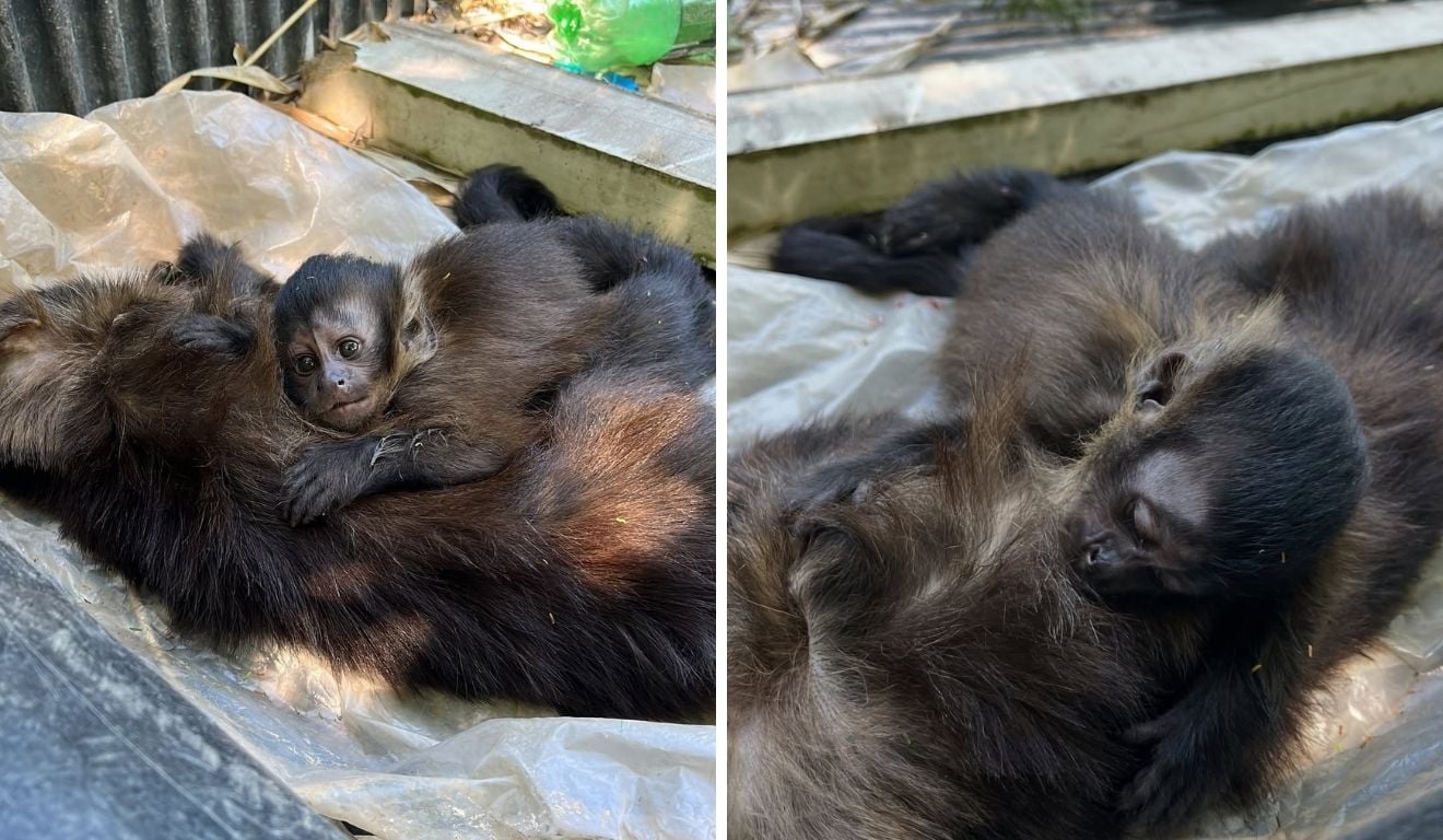 Uma macaco-prego fêmea foi atropelada por um veículo em uma rodovia que atravessa a Floresta Nacional de Pacotuba, localizada em Cachoeiro de Itapemirim, no Sul do Espírito Santo. O caso aconteceu nesta terça-feira (13) e a reação de seu filhote, que sobreviveu, emocionou que prestou o atendimento. O pequeno macaco abraçou a mãe, em sofrimento.