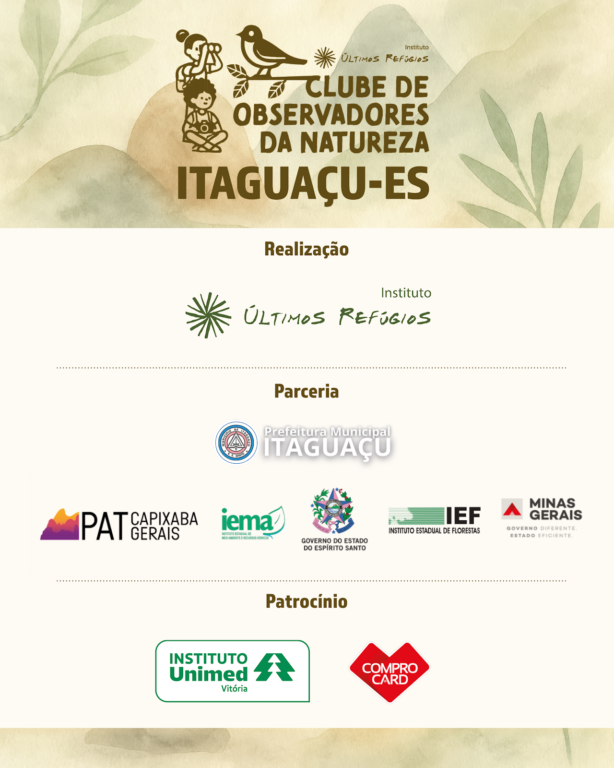 Este projeto foi realizado pelo Instituto Últimos Refúgios, com o apoio do Instituto Unimed Vitória, ComproCard, e em parceria com a Prefeitura de Itaguaçu, por meio da Secretaria de Meio Ambiente de Itaguaçu e Secretaria de Educação e Cultura de Itaguaçu, com as escolas locais (em especial a EMEIEF Pedro Thomazini) e o Clube de Observadores da Natureza Sabiá, a RPPN Garibus, e o PAT Capixaba-Gerais (Plano de Ação Territorial para Espécies Ameaçadas fora de Unidades de Conservação, coordenado pelo IEMA).