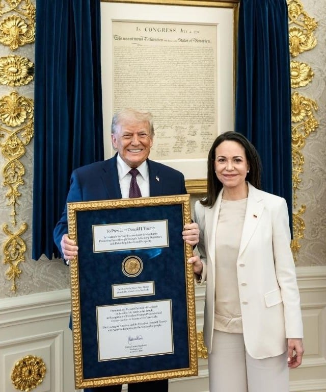 “Presenteei o presidente dos Estados Unidos com a medalha, o Prêmio Nobel da Paz”, disse María Corina, ao deixar a Casa Branca. O gesto foi um “reconhecimento” pelo “compromisso único” de Trump com a “liberdade” dos venezuelanos, segundo a opositora.