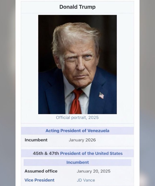O presidente americano publicou na rede Truth Social uma montagem que simula uma biografia no formato da Wikipedia, na qual aparece listado como presidente interino da Venezuela, com mandato iniciado em janeiro deste ano e sem data de término. A informação surge acima de sua identificação oficial como presidente dos Estados Unidos desde janeiro de 2025.