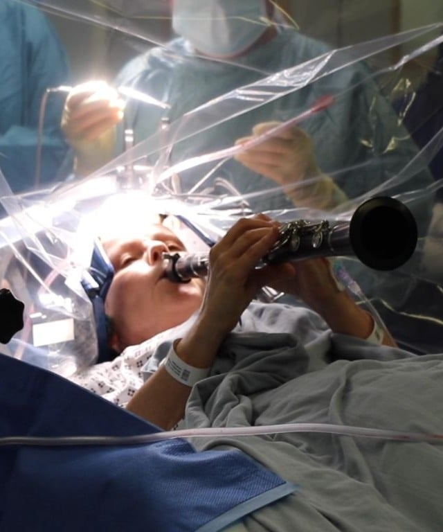 Para a cirurgia, a equipe médica aplicou um anestésico no couro cabeludo e no crânio da paciente, mas ela permaneceu acordada durante a operação para o monitoramento dos sintomas.