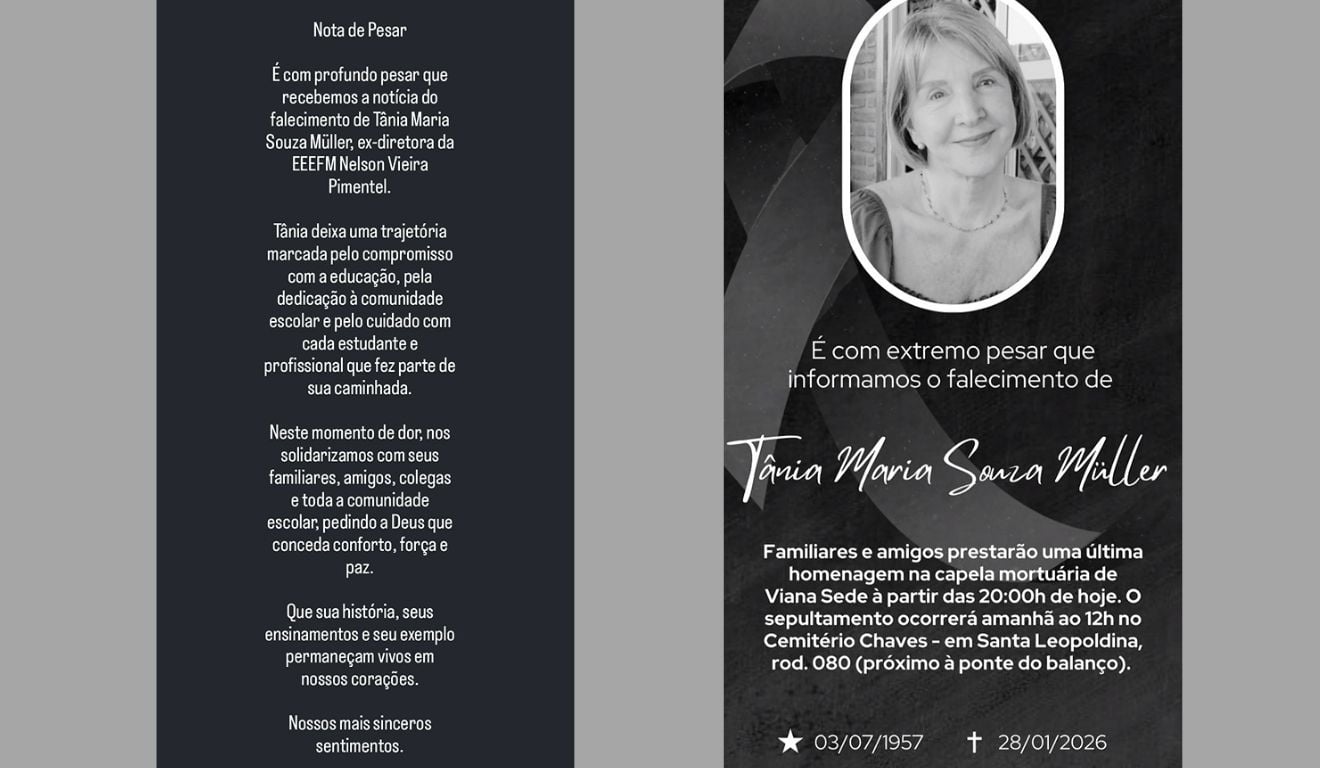 A professora de História e ex-diretora escolar de Viana Tânia Maria Souza Muller morreu na última quarta-feira (28), aos 68 anos, em decorrência de um câncer. A informação foi confirmada por um dos filhos da educadora, que morava no bairro Ribeira.