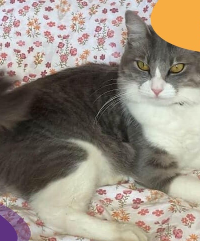 Jade é uma gata com pelagem cinza e branca, rabo peludo e olhos amarelos. Ela usa uma coleira rosa com nome e celular da tutora.