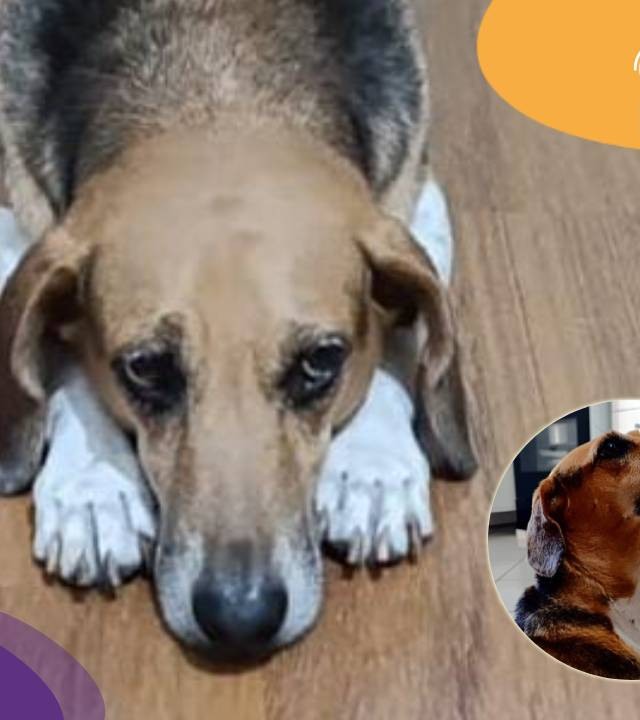 Características: Animal manso, raça beagle com basset, pelagem preta, branca e caramelo, peso entre 13 e 15 kg, faz uso de medicação.