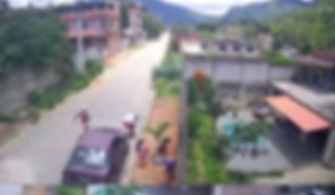 Uma câmera de segurança registrou o momento dos disparos e nas imagens é possível ver três homens e uma criança tentando se proteger.