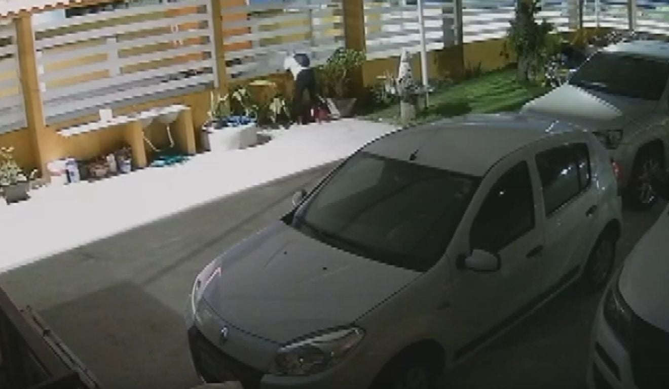 As imagens mostram o suspeito passando por uma fresta e entrando pela garagem da residência. Em seguida, ele arromba uma porta de vidro para ter acesso ao interior da casa.