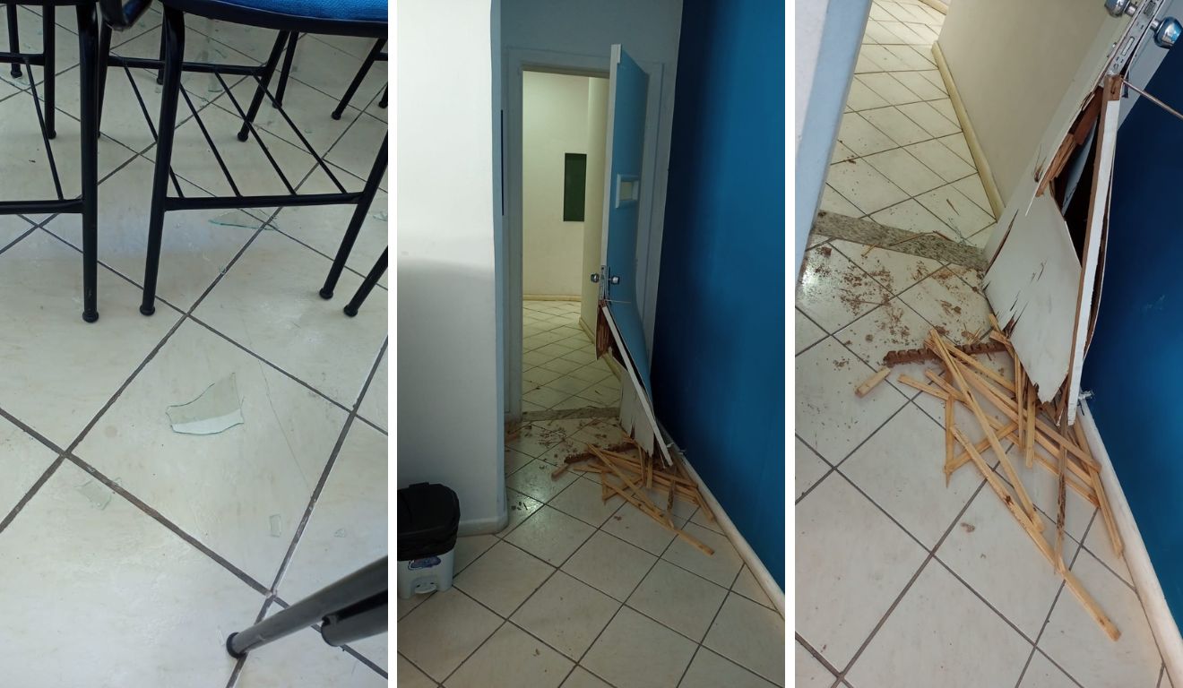 Percebi que o lixo estava todo espalhado, a janela da cozinha arrombada e o banheiro feminino vazando muita água. Fui até o local e vi que as torneiras e duchas haviam sido levadas. Depois percebi a porta de uma das salas destruída e o vidro quebrado da janela. Foi então que entendi que tínhamos sido vítimas desse infortúnio.
