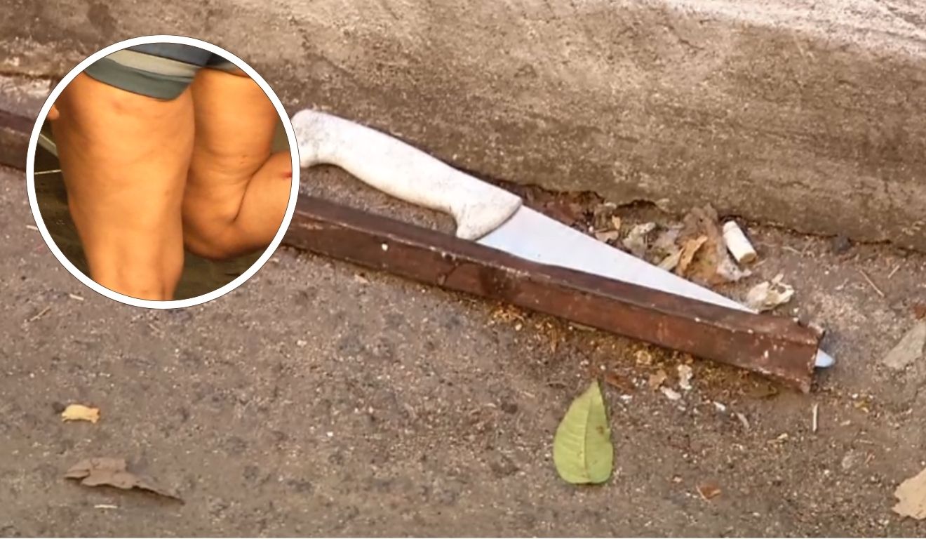 Os agentes foram até o endereço e encontraram o suspeito sendo revistado, com as mãos na parede. No chão, estavam uma faca e uma barra de ferro, apreendidas pela equipe. Da porta, a vítima acompanhava toda a abordagem e relatava ameaças do marido.