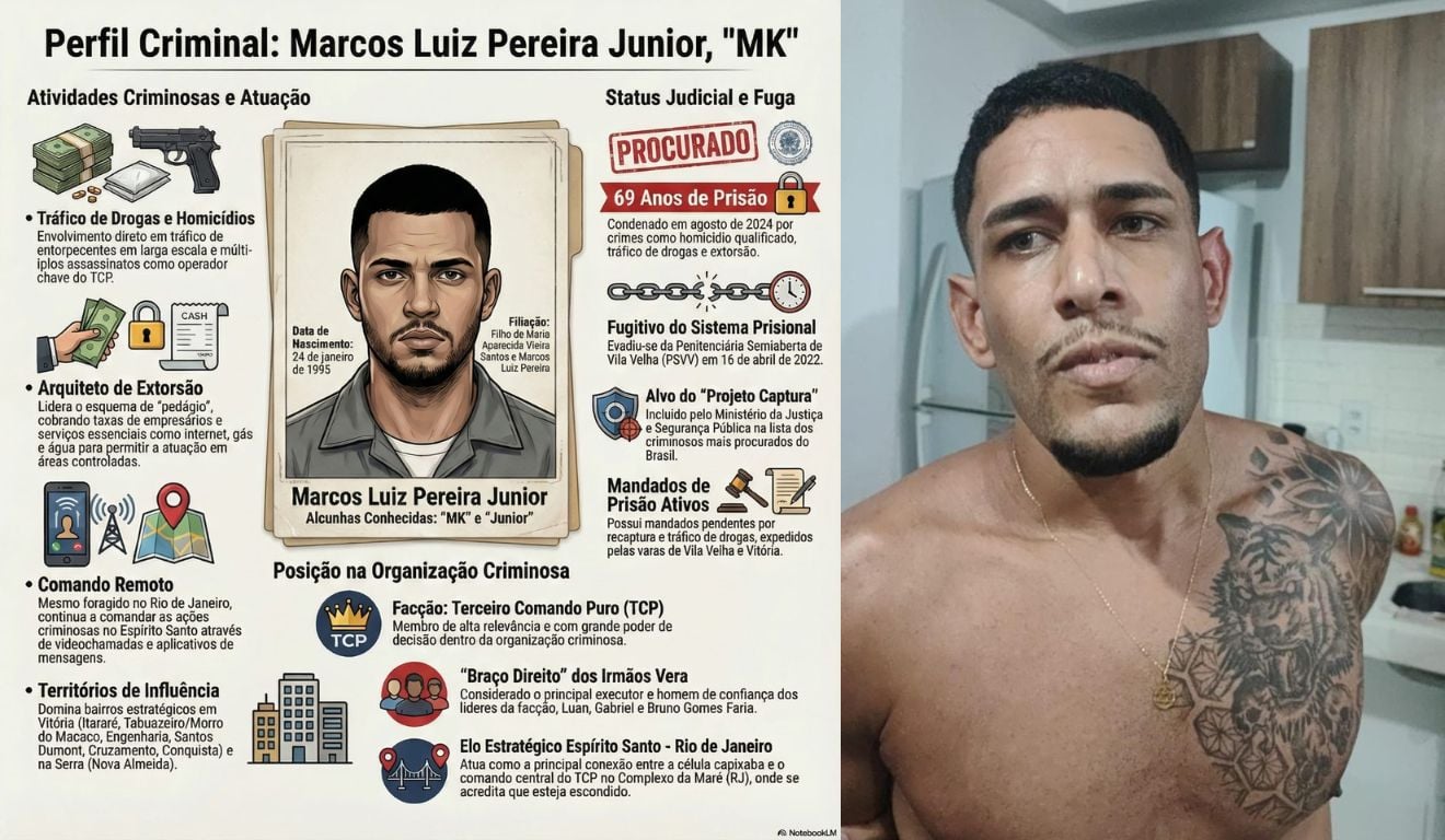 O traficante Marcos Luiz Pereira Junior, de 30 anos, conhecido como MK, preso pela Polícia Civil na última sexta-feira (2), era apontado como um dos bandidos mais procurados do Brasil e responsável por introduzir no Espírito Santo métodos de atuação da milícia do Rio de Janeiro.