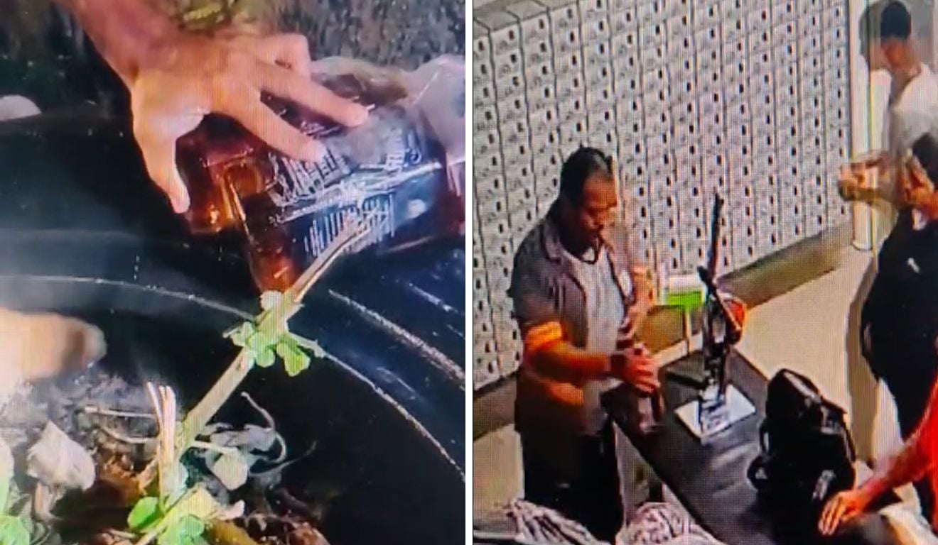 As imagens das câmeras usadas no flagrante mostram o funcionário uniformizado sendo abordado por seguranças. Em seguida, ele é instruído a retirar os pertences, até que uma garrafa de bebida alcoólica aparece escondida na cintura.