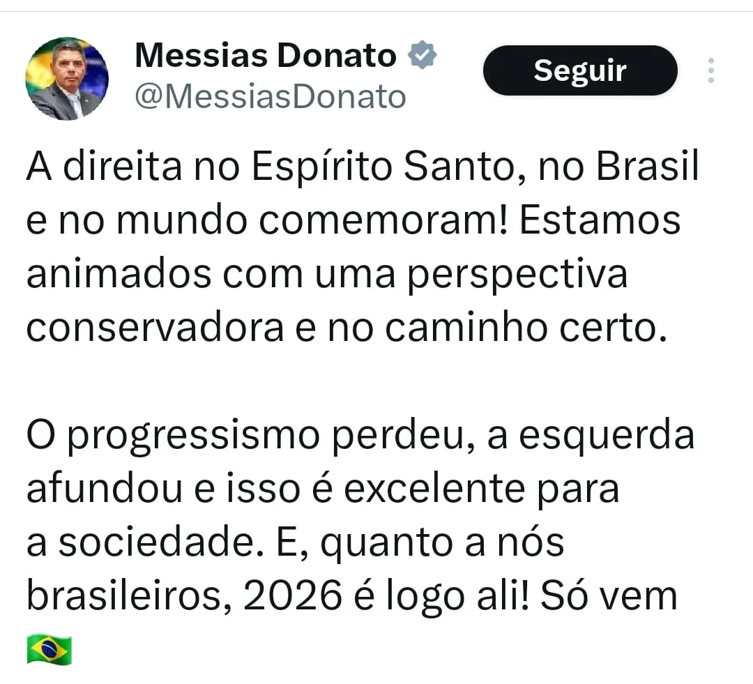 O deputado federal Messias Donato (Republicanos) disse que a direita no mundo todo comemora: “A direita no Espírito Santo, no Brasil e no mundo comemoram! Estamos animados com uma perspectiva conservadora e no caminho certo. O progressismo perdeu, a esquerda afundou e isso é excelente para a sociedade. E, quanto a nós brasileiros, 2026 é logo ali! Só vem”, disse o parlamentar.