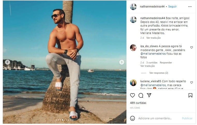 “Foi ela (esposa) quem falou para eu postar, porque eu sou tímido”. Na publicação, Nathan brinca dizendo que “depois dos 40 se arriscaria numa nova profissão”. A coluna quis saber que profissão seria essa, mas Nathan desconversou: “Foi só uma brincadeira, nem acho que foi um ensaio sexy, foi apenas um ensaio fotográfico”, justificou, aos risos.