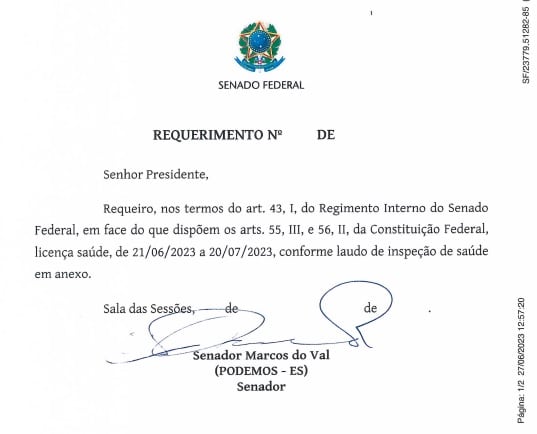“Informamos que ao contrário do que está sendo veiculado pela imprensa, o senador Marcos do Val não apresentou um atestado para adiar o seu depoimento à Polícia Federal. A licença para cuidar da sua saúde foi expedida pela junta médica do Senado Federal após o parlamentar passar mal. Esclarecemos que se trata de licença para afastamento das suas atividades junto ao Senado Federal e nada tem a ver com seu depoimento na Polícia Federal que, aliás, já estava marcado para o dia 6 de julho próximo e assim por enquanto se mantém”, diz a nota.