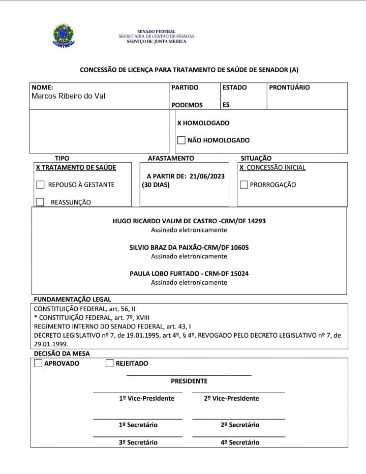 Junto ao pedido, o senador anexou um “laudo de inspeção de saúde” assinado por três médicos: Hugo Ricardo Valim de Castro – que numa rede social profissional se apresenta como presidente das Juntas Médicas Oficiais do Senado e da Câmara Federal –; Silvio Braz da Paixão e Paula Lobo Furtado.