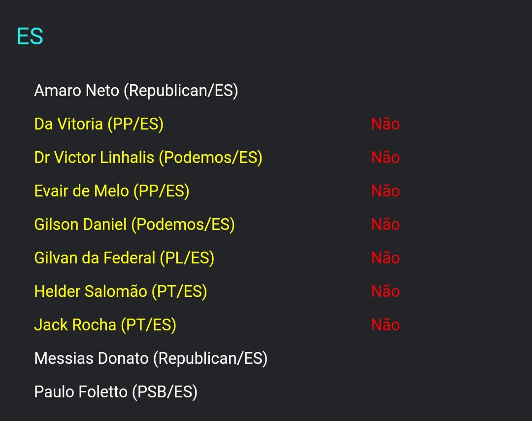 Votaram contra as mudanças do Senado: Evair de Melo (PP), Gilvan da Federal (PL) e Messias Donato (Republicanos). Já o deputado Paulo Foletto (PSB) estava ausente na votação.