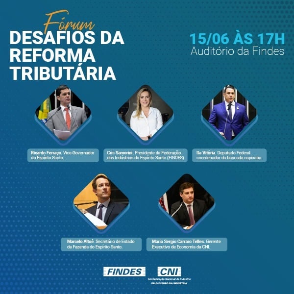 A Findes promove hoje, às 17 horas em seu auditório na Capital, o “Fórum Desafios da Reforma Tributária”, que contará com a presença do gerente executivo de Economia da Confederação Nacional da Indústria (CNI), Mario Sergio Carraro Telles, que vai apresentar os impactos e os benefícios da Reforma Tributária para o Estado e o País.