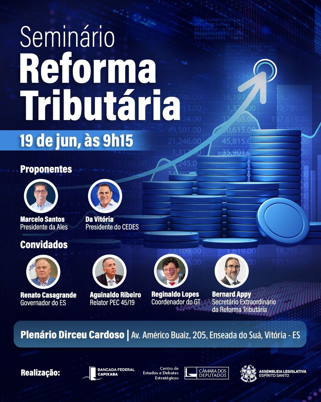 Já na próxima segunda, acontece na Assembleia o “Seminário Reforma Tributária”, organizado pelo presidente da Ales, Marcelo Santos (Podemos), e por Da Vitória, que também preside o Centro de Estudos e Debates Estratégicos da Câmara dos Deputados (Cedes).