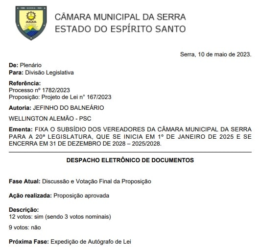 Eles também comparam com os reajustes recentes em outras câmaras, citando Vitória e Vila Velha, e afirmam que se o vereador da Serra receber menos que 35% do salário de um deputado estadual, isso violaria a lei orgânica do município, em seu artigo 102.