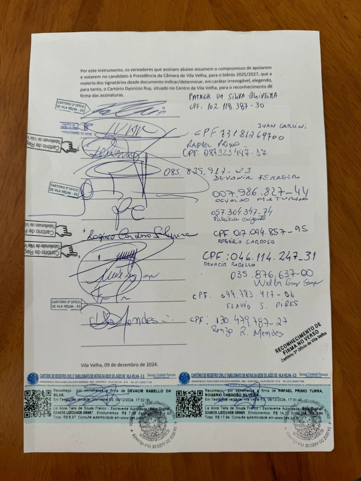 Além de Ivan, Maturano também recebeu o apoio do vereador Welber da Segurança (União), que também esteve com o prefeito, antes de decidir mudar de lado. “Comecei o dia com uma reunião com o meu amigo Osvaldo Maturano, líder do prefeito Arnaldinho, para declarar meu apoio à chapa encabeçada por ele para presidir a Câmara de Vila Velha”, escreveu Welber numa rede social.