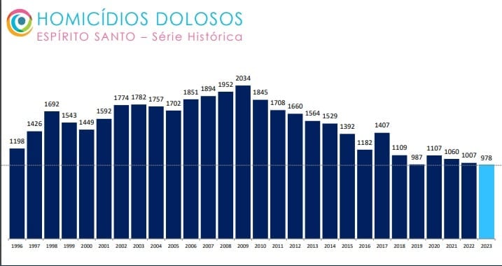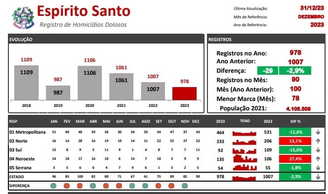 Foram contabilizados 978 assassinatos em todo o ano de 2023. Uma redução de 2,9% com relação a 2022 (quando foram registrados 1.007 homicídios), mas a menor taxa registrada desde 1996.