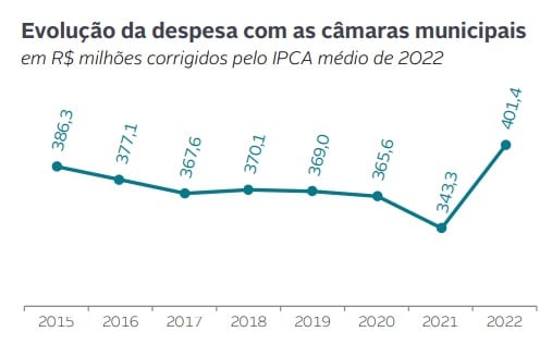 O aumento na despesa das casas legislativas vem após três anos de contração, tendo atingindo seu menor volume em 2021, com um gasto no valor de R$ 343,3 milhões, que se refere a tudo: salário dos servidores, dos vereadores e custeio das câmaras.