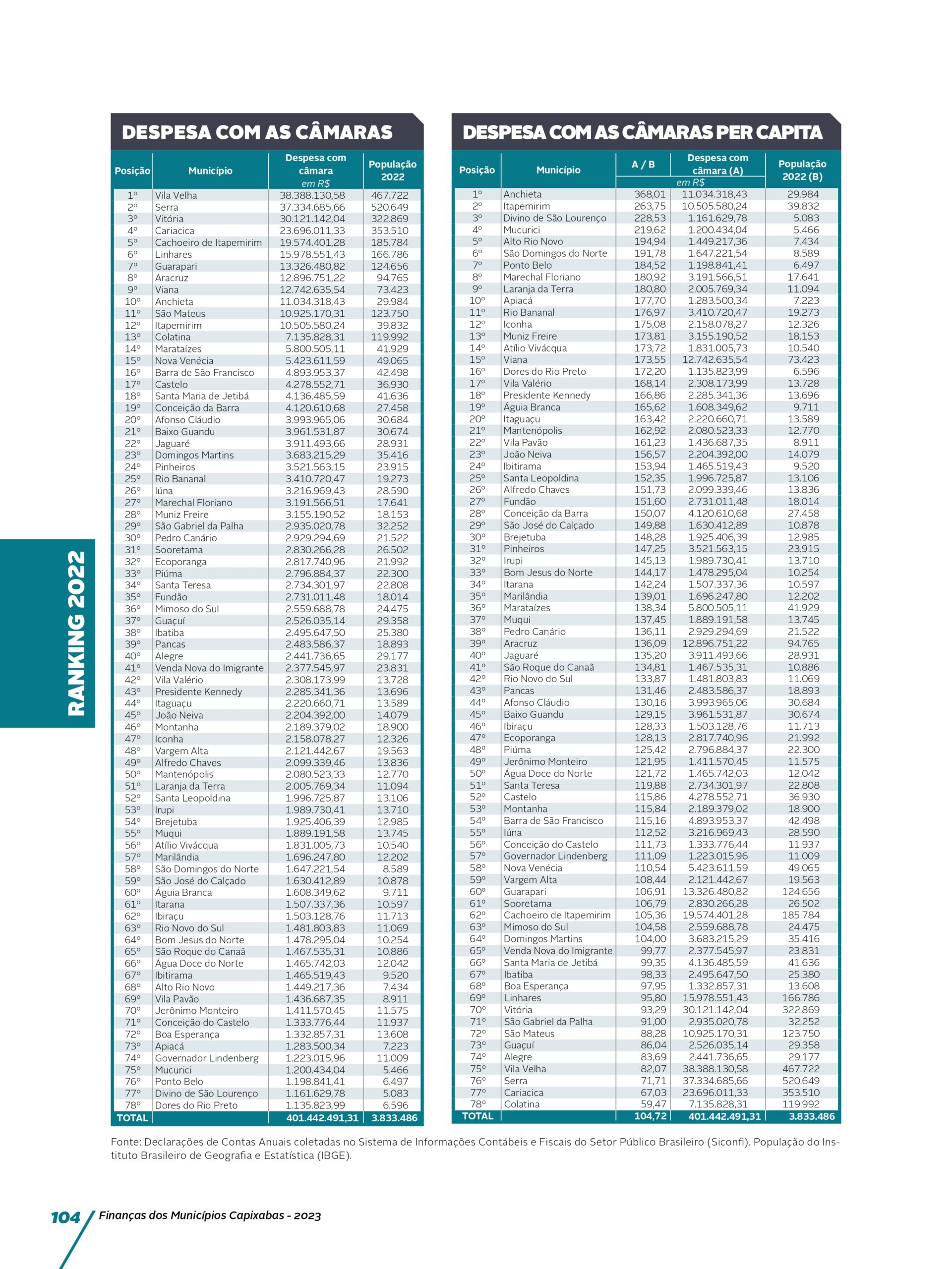 Já a Câmara de Vila Velha, que ocupava a primeira colocação em valores absolutos, passa para a 75ª posição, com um valor per capita de R$ 82,07 por habitante. A Câmara com menor gasto por habitante é a de Colatina, com valor de R$ 59,47 – o Legislativo recebeu o valor de R$ 7.135.828,31 e o município tem 119.992 habitantes.