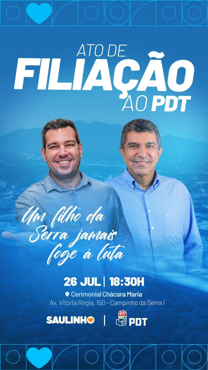 Na próxima quarta-feira (26), o PDT vai filiar o presidente da Câmara da Serra, Saulinho da Academia. O vereador, que foi convidado pelo prefeito Sergio Vidigal para entrar no PDT, pode ser a aposta do partido na eleição do ano que vem.