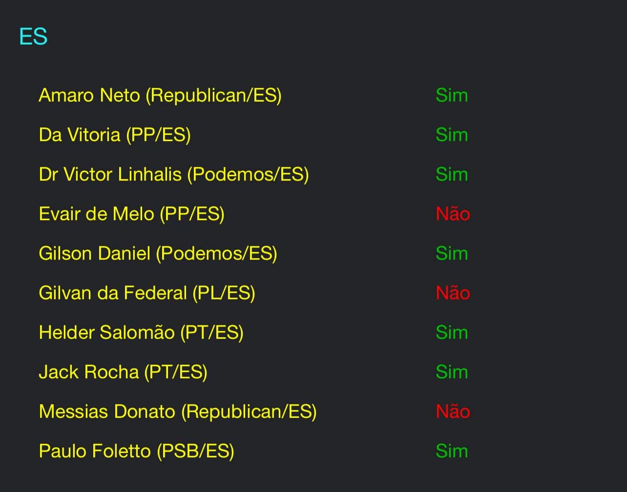 Todos os 10 deputados federais capixabas votaram e o placar ficou em 7 x 3. Votaram contra: Gilvan da Federal (PL), Messias Donato (Republicanos) e Evair de Melo (PP).