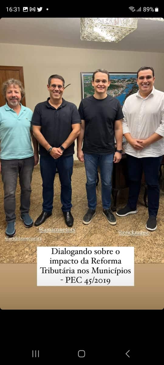 Pazolini postou foto da reunião em suas redes sociais e, oficialmente, os temas tratados foram sobre o impacto da Reforma Tributária nos Municípios, sobre emendas parlamentares para a capital e sobre o cenário político do País.