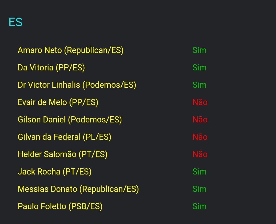 Votaram a favor, os deputados: Amaro Neto (Republicanos), Da Vitória (PP), Victor Linhalis (Podemos), Jack Rocha (PT), Messias Donato (Republicanos) e Paulo Foletto (PSB).